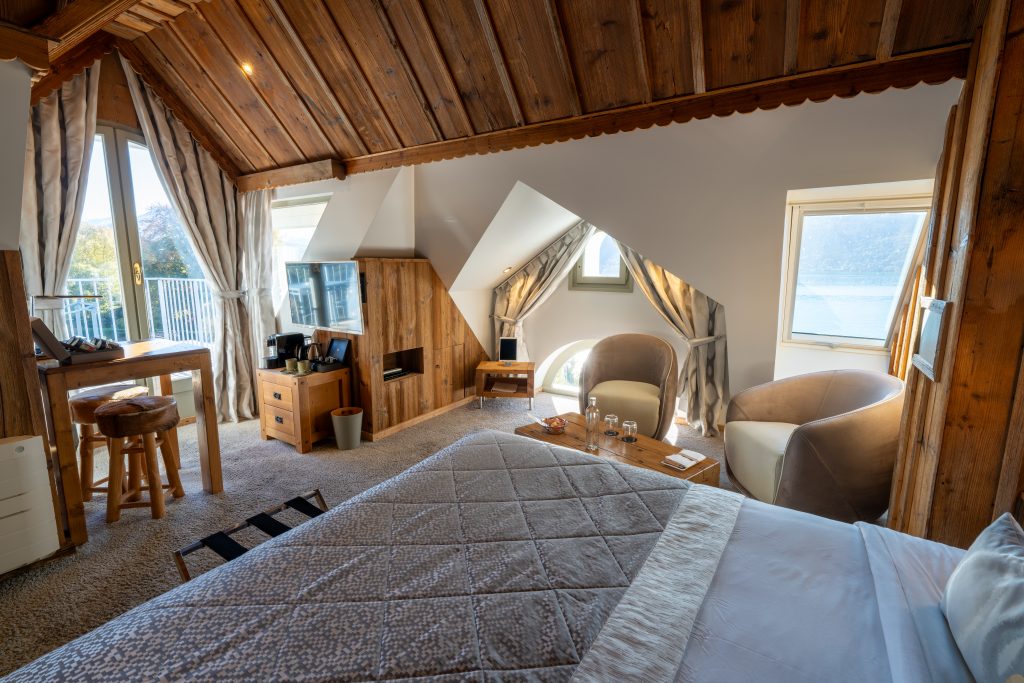 Its private balcony is a real asset, offering you a breathtaking view of the lake and the majestic mountains that surround our establishment.