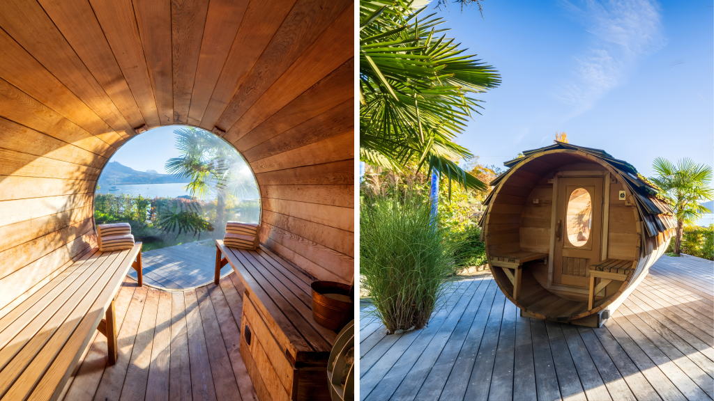 Para una mayor relajación, puedes descansar en nuestra sauna, un espacio rústico hecho de madera de cedro para seguir disfrutando de una vista inigualable del exterior gracias a su burbuja panorámica, con vistas al lago de Annecy.